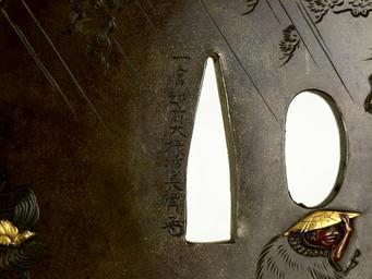 | Keywords: Ichinomiya Nagatsune - Tsuba with Mounted Warrior in the Rain - Walters 51111 - Mark.jpg At the right of the tsuba is a mounted warrior carrying an umbrella His horse's trimmings are made of gold Behind his back the small face of a passenger can be seen Incised diagonal lines indicate rain On the reverse a peasant in a straw hat and straw rain coat walks away from the horse This design may be a reference to a historical story between 1770 1786 Edo shibuichi gold details cm 7 2 6 96 0 41 accession number 51 111 8194 Henry Walters Baltimore date and mode of acquisition unknown Walters Art Museum Henry Walters Acquired by Henry Walters Signature Ichinomiya Echizen Daijo Minamoto Nagatsune place of origin Kyoto Japan Walters Art Museum license Tsuba in the Walters Art Museum Ichinomiya Nagatsune Media contributed by the Walters Art Museum needs category review |