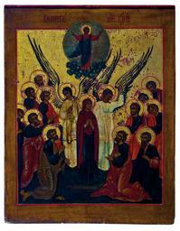 | Keywords: Icon of Ascention (19 c., Russia, private coll.).jpg The Ascention of Christ Egg t The Ascention of Christ Egg tempera on wood panel Dominating the upper part of the icon the figure of Christ displaying his stigmata amidst a glory of light Two angels in the lower section indicating the image above surrounded by the apostles The Mother of God in the centre of the composition Minimally worn Russian 19th century 36 5 x 28 5 cm Russland 19 Jh http //www auctions-fischer de/catalogues/online-catalogues/207-i-russian-greek-icons html L 1 kategorie 93 artikel 24486 L 1 cHash 8907a52e1b Ende 19 Jh anonymous 19th-century icons of Russia Private collections of Russian art Files uploaded by Shakko from various sources PD-Art Icons of Ascension |