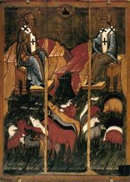 | Keywords: Icon of saint Blaise and Spiridonius.jpg Икона «Святой Власий и святой Спи идон» http //www intellectspb ru/icon/vlas_spir html 15-17 c anonymous PD-old-100 Icons of Saint Blaise Icons of Saint Spiridion Cows in art Files uploaded by Shakko from various sources Icons of saints with two persons |