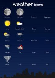 Keywords: icon set weather moon sun clouds rain thunder snowy overcast stormy temperature rainy shower dark night