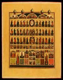 | Keywords: Iconostasis icon (19th c., Russia, priv coll).jpg Miniature Iconostasis / Private Collection Germany The icon painted in fine detail reproduces in miniature the icon screen that separates the nave from the sanctuary in the orthodox church The icon is divided in six registers The lower register is centred by the Royal Door with two more doors depicting deacons to the left and to the right Between the doors large icons are depicted showing the Synaxis of the Archangels St Nicholas the Pokrov of the Mother of God the Trinity the Beheading of St John the Forerunner and the Dormition The second row depicting fourteen icons with the most important feasts of the orthodox church the third row depicting the Deesis centred by Christ Enthroned the fourth row depicting the prophets holding open text scrolls in their hands en praying to the Mother of God Enthroned in the centre the fifth row depicting more prophets and forefathers also holding text scrolls and with God Father in the centre the sixth row depicting saints and scenes from the Passion of Christ http //www morsink com/russian-icons/miniature-iconostasis-p-20 second half 19th century RusIcon PD-old-100 Files uploaded by Shakko from various sources Private collections of Russian art 19th-century icons of Russia Icons of Old Testament figures Iconostases in Russia Multiple-images icons |