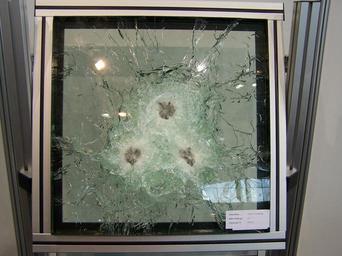 Keywords: IDET2007 bulletproof glass.jpg en Laminated bullet-resistant glass after ballistic tests From IDET 2007 fair in Brno Own Shaddack 2007-05-04 Laminated glass Broken safety glass Armour IDET 2007 Bullet-proof glass