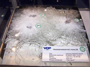 | Keywords: IDET2007 bulletproof glass armor.jpg en Bulletproof safety glass ballistic test Layered glass-polymer composite 55 6mm thick 116 3 kg/m2 ballistic resistance level 2 From IDET 2007 fair in Brno Own Shaddack 2007-05-04 Laminated glass Broken safety glass Armour IDET 2007 Bullet-proof glass |