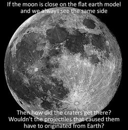 | Keywords: craters projectiles nasa news flatearth flat earth space hoax sun moon yin yang yinyang god reality plane universe curve curvature nocurve bible truth dome blackandwhite lunar monochrome black background round circle black and white If the moon is close on the flat earth model and we always see the same side. Then how did the craters get there? Wouldn't the projectiles that cause them have to be originated from Earth? FlatEarth meme collected by A.J. Wilson of iPressThis at FlatEarth.Online, made by others. If the moon is close on the flat earth model and we always see the same side. Then how did the craters get there? Wouldn't the projectiles that cause them have to be originated from Earth? FlatEarth meme collected by A.J. Wilson of iPressThis at FlatEarth.Online, made by others. |