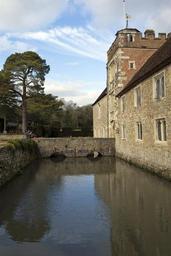 Keywords: ightham mote medieval moated manor house stonework brickwork bridge architecture water reflection sky kent uk