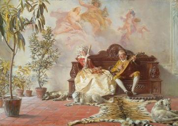 | Keywords: Ignaz Gaugengigl Scherzando.jpg Artwork creator Ignaz Gaugengigl 1903 oil canvas cm 26 36 8 institution Museum of Fine Arts Boston object history credit line accession number 24 219 http //www mfa org/collections/ PD-old-auto-1923 1932 Lutenists in art Paintings of sitting couples Gaugengigl People with musical instruments in art Sitting people in art Paintings in the Museum of Fine Arts Boston 20th-century paintings of tigers Ignaz Gaugengigl Paintings of tiger fur-skins Fur carpets in art Paintings of couples in rooms Gaugengigl Rococo revival paintings Oil paintings of tigers |