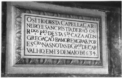 | Keywords: talha portugal robert smith robert chester smith robertchestersmith igreja de são roque igrejadesãoroque igreja fundação calouste gulbenkian fundaçãocaloustegulbenkian plaque font lisboa biblioteca de arte bibliotecadearte Inscrição lateral na nave. Talha dos séculos 17-18. Fotógrafo: Robert Chester Smith (1912-1975). Data de produção da fotografia original: 1962-1964. Transcrição do texto da inscrição: "O sítio desta capella, carneiro (?), e sancristia derão os reverendos padres desta Santa Caza á Congregação de Amor em Graça por escritura nas Notas de Gaspar de Carvalho em 13 de Maio de 1634." [CFT008.0559.ic] Inscrição lateral na nave. Talha dos séculos 17-18. Fotógrafo: Robert Chester Smith (1912-1975). Data de produção da fotografia original: 1962-1964. Transcrição do texto da inscrição: "O sítio desta capella, carneiro (?), e sancristia derão os reverendos padres desta Santa Caza á Congregação de Amor em Graça por escritura nas Notas de Gaspar de Carvalho em 13 de Maio de 1634." [CFT008.0559.ic] |