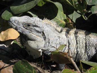 Keywords: iguana reptile wildlife mexico tulum wild tropical herbivore scales crawling exotic skin eye spike head profile leaves green