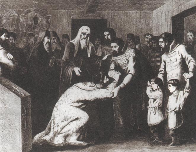 | Keywords: Примирение Василия II Темного с Шемякой.jpg en Viktor Muizhel Reconciliation of Vasily II Tyomniy with Shemyaka Title http //history sgu ru/ wid 587 ru Викто уйжель П ими ение Василия II Тёмного с Шемякой азвание http //history sgu ru/ wid 587 http //www sgu ru/rus_hist/ wid 587 1924 at the latest е позднее 1924 Viktor Muizhel Викто уйжель PD-Art ImageNote 1 355 118 106 104 640 495 2 Dmitry Shemyaka ImageNoteEnd 1 ImageNote 2 261 223 137 115 640 495 2 Vasily Tyomniy ImageNoteEnd 2 ImageNote 3 453 242 177 234 640 495 2 Ivan Vasilievich and Yury Vasilievich ImageNoteEnd 3 ImageNote 4 215 74 115 133 640 495 2 Jonah of Moscow ImageNoteEnd 4 Feudal war in Muscovy 1425-1453 Dmitry Shemyaka Viktor Muizhel Vasily II of Moscow in paintings |