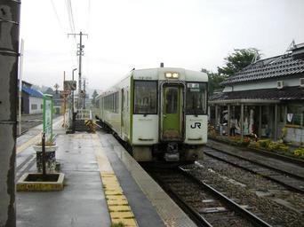 Keywords: Iiyama line and Iiyama Station home.JPG A JR East KiHa 110 series 2-car DMU at the former Iiyama Station on the Iiyama Line in Nagano Prefecture 長野 飯山市の飯山駅のホームで撮影 Own 2007-08-28 ジ ネ Jidane JR East KiHa 100 series Iiyama Station