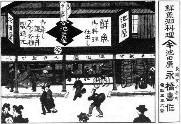| Keywords: Ikedaya in Taisyo era.jpg ja 大正 の池田屋(新潟 長岡市) 絵画北越商工便覧 井政太郎編 大正8(1919)年刊より bentō shop in Nagaoka Niigata Prefecture Japan in Taishō era 1919 絵画北越商工便覧 ( 井政太郎編 大正8(1919)年刊) 国立国会図書館デジタルコレクション Japanese book Kaiga Hokuetsu Shōkō Benran published in 1919 Collection of books of the National Diet Library Japan http //dl ndl go jp/info ndljp/pid/967293/19 NDL http //dl ndl go jp/info ndljp/pid/967293/19 井政太郎 other versions 図内の文字 Characters in this figure 鮮魚御料理 池田屋 長岡市千手町 永橋 電話三三六番<br> 鮮魚 御料理 仕出し 池田屋 御寿し 親子丼 でんぶ各種 製 元 Custom license marker 2016 05 05 PD-Japan Ikedaya Nagaoka Kaiga Hokuetsu Shōkō Benran |