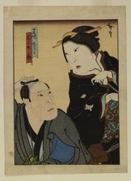 | Keywords: Ikekichi - A Conversation - Walters 9598.jpg The play depicted in this print has not yet been identified but the two actors here could be husband and wife or innkeeper and guest The double-portrait format is unusual; Hirosada's half-length portraits okubi-e usually feature just an individual actor ca 1850 1855 late Edo mulberry paper color ink cm 23 5 18 accession number 95 98 7585 Justine Lewis Keidel date and mode of acquisition unknown Walters Art Museum Gift of Justine Lewis Keidel 1986 Signature Hirosada place of origin Osaka Japan Walters Art Museum license 2D Japanese prints in the Walters Art Museum Historic samurai prints Media contributed by the Walters Art Museum needs category review Konishi Hirosada |