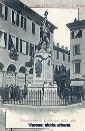 Keywords: Copia in bronzo (1901) della statua di Luigi Buzzi Leone (originale in pietra del 1861) raffigurante i Cacciatori delle Alpi in piazza del Podestà. Alle spalle del monumento palazzo Biumi (1590). varese