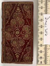 | Keywords: Il Petrarca nuovamente risampato - Upper cover (Davis204).jpg Style Centrepiece made of small tools Acorn Thistle Floral Oval motif; Caption Upper cover; Colour Red; Edge Unspecified exhibition history Decorative Technique Tooled in gold; Cover Material Goatskin includes morocco turkey etc Metallic varnish paper endleaves object history Text 1624; Venice; Unspecified object type Cc-zero place of creation Binding England place of discovery See M M Foot The Henry Davis Gift vol II London 1983 British Library image http //www bl uk/catalogues/bookbindings/LargeImage aspx RecordId 020-000003614 ImageId ImageId 41412 Copyright BL Il Petrarca nuovamente risampato Uploaded with GWToolset Il Petrarca nuovamente risampato - Upper cover Davis204 http //www webarchive org uk/bldatasets/bindings/5930_4 jpg Bookbinding 18th-century bookbinding |