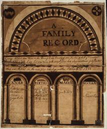 | Keywords: Illustrated family record (Fraktur) found in Revolutionary War Pension and Bounty-Land-Warrant Application File... - NARA - 300148.jpg Scope and content Illustrated family record in English Black and white; the paper is sewn together General notes Original Located at TR3334 300148 Local identifier Department of the Interior Bureau of Pensions 1849 - 1930 Most Recent <br /> War Department Office of the Secretary 1789 - 09/18/1947 Predecessor <br /> War Department Military Bounty Lands and Pension Branch ca 1810 - 1815 Predecessor Archives I Reference Section Textual Archives Services Division NWCT1R National Archives Building 7th and Pennsylvania Avenue NW Washington DC 20408 other date circa 1800 1900 Record group Record Group 15 Records of the Department of Veterans Affairs 1773 - 2007 Record group ARC 344 Case Files of Pension and Bounty-Land Warrant Applications Based on Revolutionary War Service compiled ca 1800 - ca 1912 documenting the period ca 1775 - ca 1900 Series ARC 300022 File unit Revolutionary War Pension and Bounty-Land-Warrant Application File W21807 for George Mitchell Connecticut ca 1800 - ca 1900 File unit ARC 300147 Variant control numbers NAIL Control Number NWCTB-15-NM22E19-W21807-SLIDE42<br /> NAIL Control Number NWDT1-15-NM22E19-W21807-SLIDE42 Other versions <gallery> File Illustrated_family_record_ Fraktur _found_in_Revolutionary_War_Pension_and_Bounty-Land-Warrant_Application_File _-_NARA_-_300148 tif tif File Illustrated_family_record_ Fraktur _found_in_Revolutionary_War_Pension_and_Bounty-Land-Warrant_Application_File _-_NARA_-_300148 jpg jpg </gallery> NARA-cooperation PD-USGov Family historical documents of the United States Fraktur Documents in English |