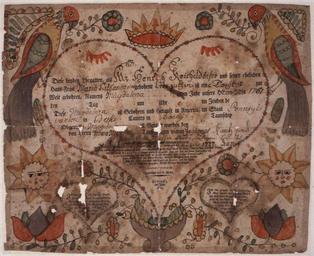 | Keywords: Illustrated family record (Fraktur) found in Revolutionary War Pension and Bounty-Land-Warrant Application File... - NARA - 300236.jpg Scope and content Illustrated family record in German Printed birth and baptismal certificate by Friederich Krebs 1800 Colorfully illustrated by hand with birds suns or stars and tulips General notes Original Located at TR3240 300236 Local identifier Department of the Interior Bureau of Pensions 1849 - 1930 Most Recent <br /> War Department Office of the Secretary 1789 - 09/18/1947 Predecessor <br /> War Department Military Bounty Lands and Pension Branch ca 1810 - 1815 Predecessor Archives I Reference Section Textual Archives Services Division NWCT1R National Archives Building 7th and Pennsylvania Avenue NW Washington DC 20408 other date circa 1800 1900 Record group Record Group 15 Records of the Department of Veterans Affairs 1773 - 2007 Record group ARC 344 Case Files of Pension and Bounty-Land Warrant Applications Based on Revolutionary War Service compiled ca 1800 - ca 1912 documenting the period ca 1775 - ca 1900 Series ARC 300022 File unit Revolutionary War Pension and Bounty-Land-Warrant Application File W6053 Jacob Shoemaker Pennsylvania ca 1800 - ca 1900 File unit ARC 300235 Variant control numbers NAIL Control Number NWCTB-15-NM22E19-W6053-SLIDE79<br /> NAIL Control Number NWDT1-15-NM22E19-W6053-SLIDE79 Other versions <gallery> File Illustrated_family_record_ Fraktur _found_in_Revolutionary_War_Pension_and_Bounty-Land-Warrant_Application_File _-_NARA_-_300236 tif tif File Illustrated_family_record_ Fraktur _found_in_Revolutionary_War_Pension_and_Bounty-Land-Warrant_Application_File _-_NARA_-_300236 jpg jpg </gallery> NARA-cooperation PD-USGov Family historical documents of the United States |