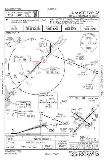 | Keywords: ILS RWY 23 KBUF.svg FAA ILS approach plate for runway 23 at Buffalo Niagara International Airport KBUF marked with the location of the crash site of Colgan Air Flight 3407 ILS_RWY_23_KBUF jpg 2010-03-12 03 09 UTC ILS_RWY_23_KBUF jpg Original uploader was Centpacrr at http //en wikipedia org en wikipedia derivative work Atmoz <span class signature-talk >talk</span> convert to svg Atmoz ILS_RWY_23_KBUF jpg PD-USGov original upload log This image is a derivative work of the following images File ILS_RWY_23_KBUF jpg licensed with PD-USGov 2009-04-16T19 07 18Z Centpacrr 1202x1787 437307 Bytes <nowiki>Added crash site to approach plate</nowiki> 2009-02-15T12 42 04Z Matthiasb 1202x1787 433415 Bytes <nowiki> 0 Transferred from http //en wikipedia org en wikipedia; transferred to Commons by User Matthiasb using http //tools wikimedia de/~magnus/commonshelper php CommonsHelper Dat</nowiki> Uploaded with derivativeFX Aviation in the United States Buffalo Niagara International Airport Colgan Air Flight 3407 |
