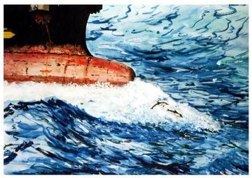 Keywords: image painting ship sea ocean bow wave water dolphin