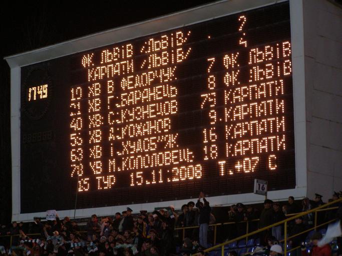 | Keywords: Табло - львівське дербі.JPG en Scoreboard of Ukrayina Stadium after the final whistle of Lviv derby FC Lviv vs FC Karpaty Lviv uk Табло стадіону Ук аїна після фінального свистка львівського де бі Львів - Ка пати own PavloFriend 2008-11-15 Association football scoreboards Matches of FC Karpaty Lviv Matches of FC Lviv Ukraine Stadium Lviv |