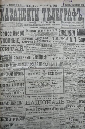 | Keywords: Первая страница газеты =Казанский Телеграф= (№ 6480 от 13 января 1915 года).jpg ru Пе вая ст аница газеты Казанский Телег аф 6480 от 13 янва я 1915 года own Алексеев Иго ь Евгеньевич 2009-03-06 PD-RusEmpire Monarchism History of Tatarstan Media of Kazan Newspapers of Russia 1915 Kazansky Telegraf |