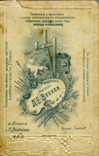 | Keywords: Обратная сторона карточек Зузули.jpg Об атная сто она ка точек Зузули Юзовка http //molotok ru/item1080068773_yuzovka_dvoe_v_furazhkah html end XIX - begin XX century Фотоателье Зузули PD-RusEmpire Files uploaded by Andrew Butko from various sources Photostudio of Zuzulia Donetsk in the unidentified decade Historical non-photos images of Donetsk by alphabet Images from molotok ru | ||||