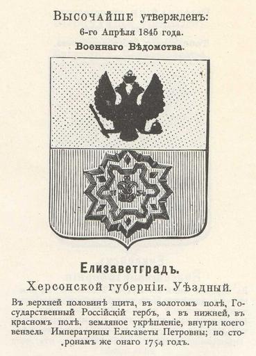 | Keywords: Герб Елизаветграда Херсонской губернии (Винклер).jpg ru Гласный ге б Елизаветг ада с официальным описанием в Ге бовнике Винкле а 1845-04-06 O S adopted 1899 published File Елабуга Елатьма Елец Елизаветг ад из Винкле а jpg П П фон Винкле PD-RusEmpire Uploaded with UploadWizard Coats of arms of Kherson Governorate Coats of arms of Kirovohrad Gerbovnik Vinklera - City CoAs Елизаветг ад Russian canting arms | ||||