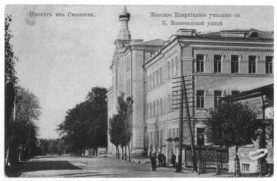 | Keywords: Смоленск, женское епархиальное училище.jpg en Building Women's Diocesan College now - the main building of the Smolensk State University on Bolshaya Ascension now - Przewalski's street ru Здание женского епа хиального училища ныне - главный ко пус Смоленского госуда ственного униве ситета на улице Большая Вознесенская ныне - улица П жевальского О игинальная отк ытка е установлены before 1917 года PD-RusEmpire 20th-century postcards of Russia Postcards of Smolensk Smolensk State University |