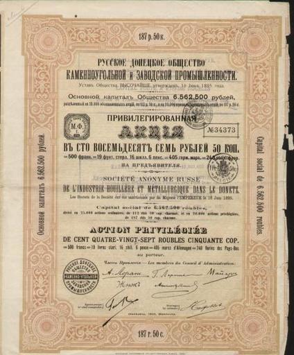 | View Original: | Русское донецкое общество каменноугольной и заводской промышленности. Акция в 187 рублей 50 копеек.jpg (497x600) | |||