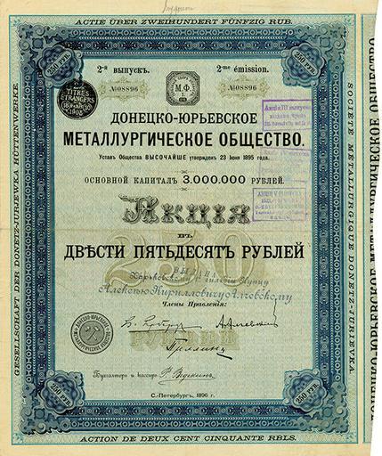 | Keywords: Донецко-Юрьевское металлургическое общество. Акция в 250 рублей.jpg Донецко-Ю ьевское металлу гическое общество Акция в 250 ублей http //infodon org ua/postal/269 < 1917 author PD-RusEmpire Stock certificates from Luhansk Oblast Files uploaded by Andrew Butko from various sources Alchevsk Iron Steel Works Images from infodon org ua |