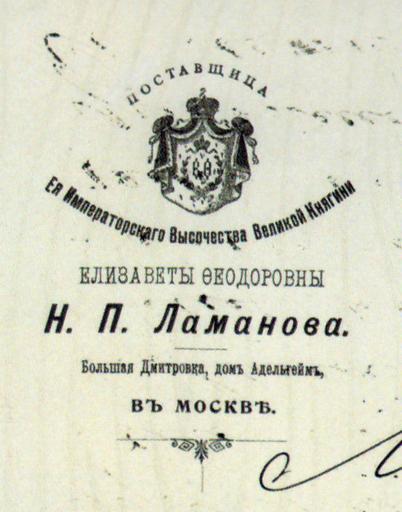 | Keywords: Знак поставщицы Великой Княгини Елизаветы Фёдоровны. Н.П.Ламанова.jpg ru Поставщица Ея Импе ато скаго Высочества Великой Княгини Елизаветы Фёдо овны П Ламанова Большая Дмит овка Домъ Адельгеймъ Въ осквъ 2015-11-29 06 42 55 own F aristocrat other versions PD-RusEmpire Uploaded with UploadWizard Documents of the Russian Empire |