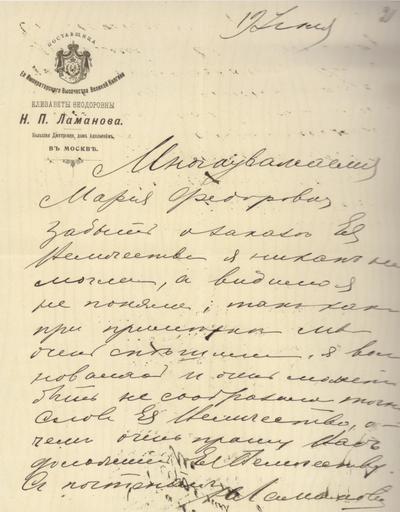 | Keywords: Письмо Марии Фёдоровне.jpg ru ногоуважаемая а ия Фёдо овна забыть о заказе её величества я никак не могла а видимо я не поняла так как п и п име ке мы очень спешили я волновалась и очень может быть не сооб азила точно слов её величества о чём очень п ошу вас доложить её величеству С почтением Ламанова 2015-11-29 06 32 57 own F aristocrat other versions PD-RusEmpire Uploaded with UploadWizard Documents of the Russian Empire | ||||