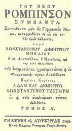 | Keywords: Εξώφυλλο βιβλίου του Κ.Μπέλλιου.jpg el Το εξώφυλλο του βιβλίου της μετάφρασης του Ροβινσώνα α ό τον Κ έλλιο Βιέννη 1792 en Cover of Robinson Krusoe of Defoe translation by Konstantinos Bellios published in Vienna in 1792 Old book cover published in Wienna Konstantinos Bellios 1792 Cc-zero Title pages in Greek Title pages from Austria 1792 books Robinson Crusoe Konstantinos Vellios Translations | ||||
