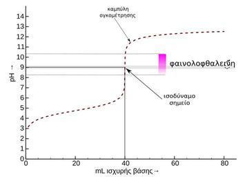 Keywords: Τιτλοδότηση ασθενούς οξέος με ισχυρή βάση.svg en Titration curve weak acid-strong base el Καμ ύλη τιτλοδότησης ασθενούς οξέος α ό ισχυρή βάση με δείκτη φαινολοφθαλεΐνη own Xhmikos 12/7/2011 Cc-zero Titration