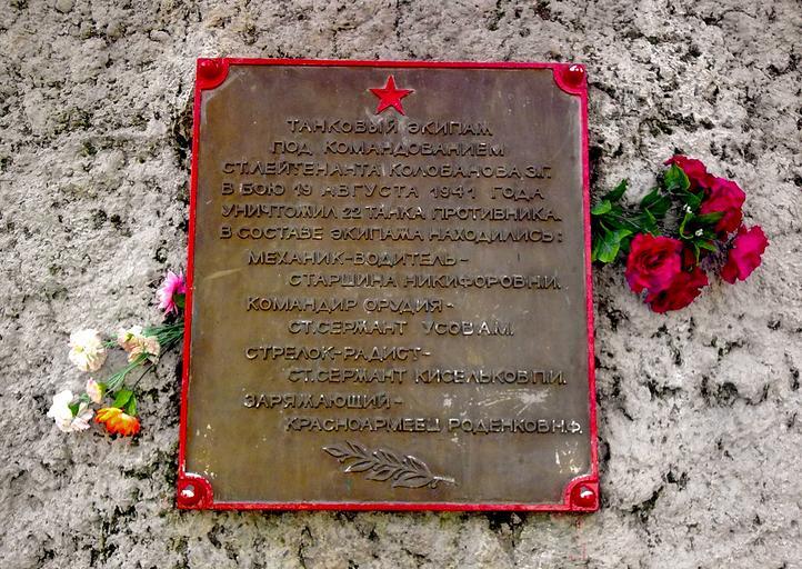 | Keywords: Памятная доска на постаменте памятника2.jpg ru Танковый экипаж под командованием ст Лейтенанта Колобанова З Г В бою 19 августа 1941 года уничтожил 22 танка п отивника В составе экипажа находились механик-водитель - ста шина икифо ов И команди о удия - ст се жант Усов А ст елок- адист - ст се жант Кисельков П И за яжающий - к асноа меец Роденков Ф own Uchkhoz1 2011-08-06 Cc-zero Novyy Uchkhoz Zinoviy Kolobanov Plaques in Leningrad Oblast Plaques in Russian Plaques referencing 1941 Military plaques |