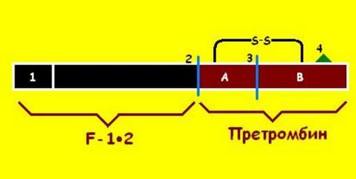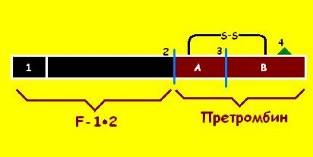 | Keywords: Схема стороения протромбина.jpg en Protrombin II factor ru Схема ст оения п от омбина <br />1 участок соде жащий γ-ка боксиглутамат <br />2 и 3 Сайты асщепления X факто ом<br />4 каталитически активный участок будущего т омбина own Сделана на основе схемы Р а и Д Г енне П ейес В Родуэлл 2011-11-04 Cc-zero Coagulation |