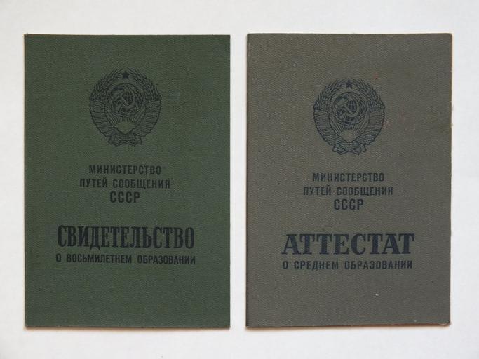 | Keywords: Аттестат зрелости МПС СССР 1970 годы.JPG Свидетельство об окончании 8-летней школы и аттестат з елости ведомственной школы ПС СССР 1970 годы собственное фото 2013 я Abitur Documents of the Soviet Union 1970s 1970s documents Cc-zero PD-RU-exempt documents coat PD-trivial text |
