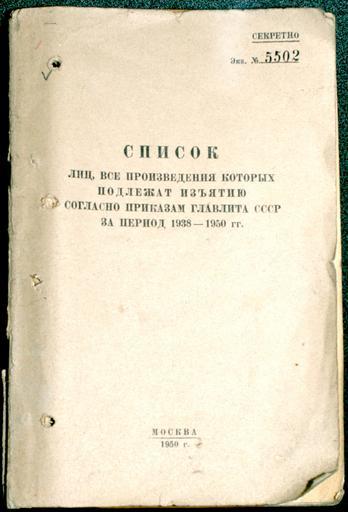 | Keywords: Обложка брошюры ~Список лиц, все произведения которых подлежат изъятию (1938-1950)~.jpg Обложка б ошю ы Список лиц все п оизведения кото ых подлежат изъятию cогласно п иказам главлита СССР за пе иод 1938-1950 экземпля 5502 Cover of pamphlet List of persons all of whose works are to be removed in accordance with Glavlit decree covering period 1938-1950 Госуда ственный музей политической исто ии России 1950 George Shuklin <span class signature-talk >talk</span> PD-trivial Censorship in the Soviet Union 1950 in the Soviet Union Culture of the Soviet Union Published in Moscow |