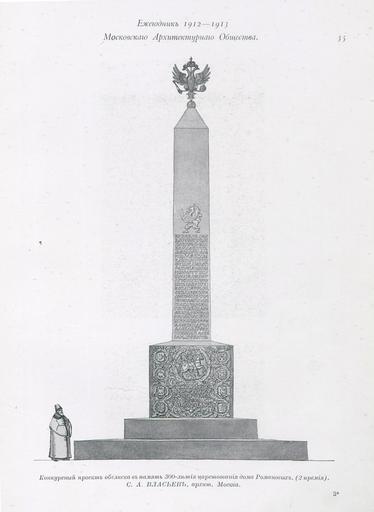 | Keywords: Эскиз Власьева.jpg ru Конку сный п оект обелиска в память 300-летия ца ствования дома Романовых 2-я п емия С А Власьев Ск ин из ежегодника осковского А хитекту ного Общества 1912-1913 гг 2013-10-31 03 41 28 own Hitrovka cc-zero Uploaded with UploadWizard Sergej Vlasiev Obelisk in Alexandrovsky Garden Monuments to Russian royalty |