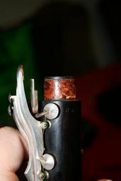 | Keywords: penzal müller mueller clarinet a wood vintage depth of field Here we see the upper to lower connector, that connects the tone hole rings from top to bottom. When I first put the horn together this piece was not quite right. The rings on the lower half would not lay flat when pressed. I had to gently bend this guy up so that it was in tolerance. It's not perfect, but the cork padding is gone and once that is replaced there should be no play between the two parts. Here we see the upper to lower connector, that connects the tone hole rings from top to bottom. When I first put the horn together this piece was not quite right. The rings on the lower half would not lay flat when pressed. I had to gently bend this guy up so that it was in tolerance. It's not perfect, but the cork padding is gone and once that is replaced there should be no play between the two parts. |