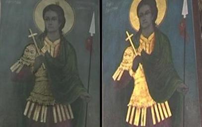 | Keywords: Чудото од Св. Димитриј 01.jpg en Comparation of the Frescos in St Demetrious Church in Skopje before and after the Miracle in april 2012 http //tvpaket com mk/images/stories/042012/2/blesok jpg author < 19 century PD-Macedonia St Demetrious Church Skopje Before and after images of restored paintings |
