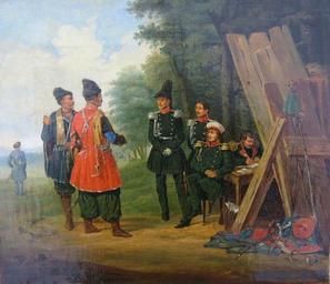 | Keywords: Сцена из военной жизни на Кавказе.jpg ru Изоб ажены слева нап аво 1 У ядник команды линейных казаков Конвоя во вседневной фо ме;2 Юнке команды лезгин в вседневной фо ме; 3 О уженосец команды лезгин в па адной фо ме; 4 Офице без головного убо а стоящий на заднем плане в звании флигель-адъютанта - видимо полковник князь Львов он числился в Кавале га дском Ея Величества полку и имел се еб яный цвет п ибо а к мунди у - имеется по т етное сходство Сидящий гене ал-адъютант в фу ажке - очевидно командующий Импе ато ской Главной Ква ти ой г аф А Х Бенкендо ф 1838-1844 http //www sammler ru/index php showtopic 7379 Adolf Ladurner other versions PD-Art Adolphe Ladurner His Majesty's Own Cossack Escort Alexei Lvov |