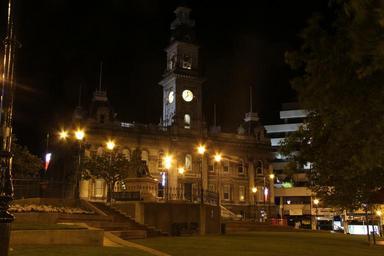 Keywords: Octagon is the center of Dunedin city, New Zealand. You can see Robert Burns statue, old municipal city council chambers with clock (center), and new council building (right).