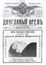 | Keywords: ПОМЯНИ ПРАВОСЛАВНЫЙ РУССКІЙ НАРОДЪ.jpg ru титульный лист газеты «Двуглавый о ёлъ» от 11 ма та 1912 года 63-й Title page of the Russian newspaper «Dvuglavyj Orelli» 11 March 1912 63-j http //katrisch livejournal com/23078 html Author 1912 03 11 ма тъ 1912 года PD-old-100-1923 Antisemitism in Russia 11 March Newspapers of Russia 1912 Cyrillic writing Crowned double-headed eagle in supporters Antisemitic periodicals Newspapers of Russia to be categorised by name | ||||