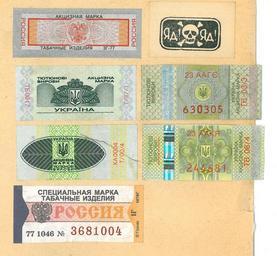 | Keywords: Табачные акцизные марки России Украины.jpg Акцизные ма ки на табачные изделия све ху вниз 1 - России 1994 года осква ; 2 - Ук аины 1996 года 3 - Ук аины 2000 года 4 - России 2002 года осква ; 6 - Ук аины 2003 года Че касская область ; 7 - Ук аины 2008 года Че касская область в х онологическом по ядке с 1990х по 2008 све ху вниз и слева нап аво по двум столбцам Также 5 - этикетка для лека ств Яд для советских аптек 1930-х годов scan by User Vizu 1930s end 1990s-2008 Ukraine NBY Russia Goznak PD-UA-exempt revenue stamps PD-RU-exempt revenue stamps PD-old Revenue stamps of Ukraine Tridents on stamps Stamps of Russia unidentified year Various stamps in one image Stamps of Russia to be categorised by subject |