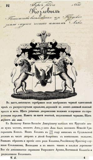 | Keywords: Герб рода Козловых.jpg ru Ð“ÐµÑ Ð± одного из Ñ Ð¾Ð´Ð¾Ð² Козловых http //gerbovnik ru Author 1807-01-23 PD-old-100 Coats of arms of Russian noble families - K Obschij gerbovnik dvoryanskikh rodov Rossii House of Kozlov |