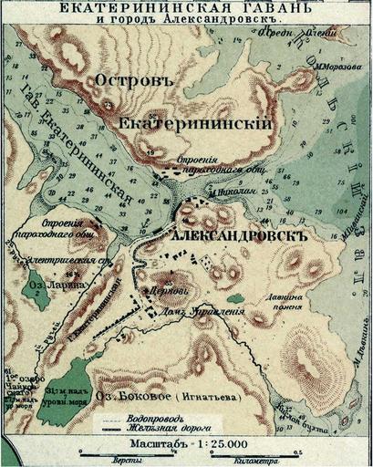 | Keywords: Екатерининская гавань и город Александровск.jpg ru 1903 г Екате ининская гавань и го од Александ овск астольный атлас А Ф а кса 1903 год асштаб 1 25 000 см http //www kolamap ru/library/doc/alexandrovsk htm А Ф а кс 1903 PD-old Polyarny Maps of the history of Murmansk Oblast Ekaterininskaya Bay |