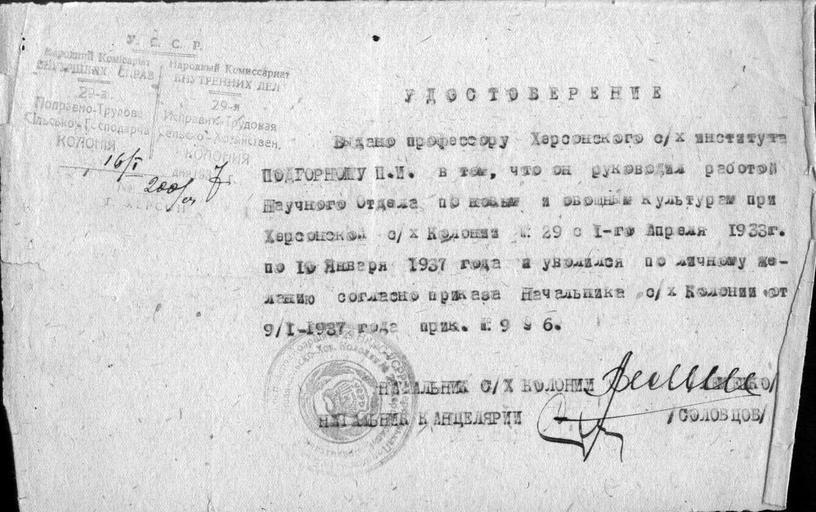 Keywords: Подгорный НКВД.jpg ru Удостове ение Подго ного П И Личный а хив Успенской Ю В Вантус PD-old-70 Scientists from Russia unidentified field Pavel Podgorny People of the Soviet Union Documents of NKVD