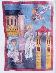 Keywords: Евангелие Мугни.jpg ru Евангелист Иоанн с учеником П охо ом иниатю а из огнийского Евангелия XI век http //www pravenc ru/text/209475 html http //www pravenc ru PD-Art Mugni Gospels Miniatures of Saint John the Evangelist