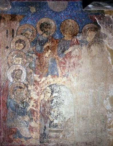 | Keywords: სულთმოფენა.jpg The mural in Betania Monastery Georgia The mural is called სულთმ ფე ა The official disk of Betania monastery XII-XIII centuries Created by order of Queen Tamar of Georgia PD-Art Betania southern wall murals Asomtavruli frescos |
