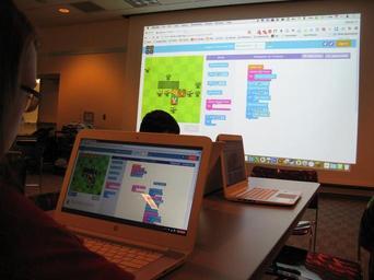 Keywords: kalamazoo kalamazoo public library kalamazoopubliclibrary code electronics screen indoor computer screen display screen monitor table KPL Code Camp: Teens work together to solve problems while learning basic computer programming skills, www.kpl.gov KPL Code Camp: Teens work together to solve problems while learning basic computer programming skills, www.kpl.gov
